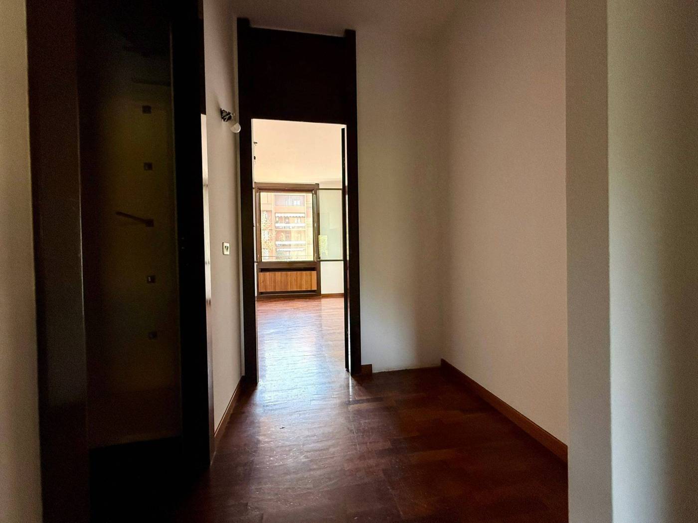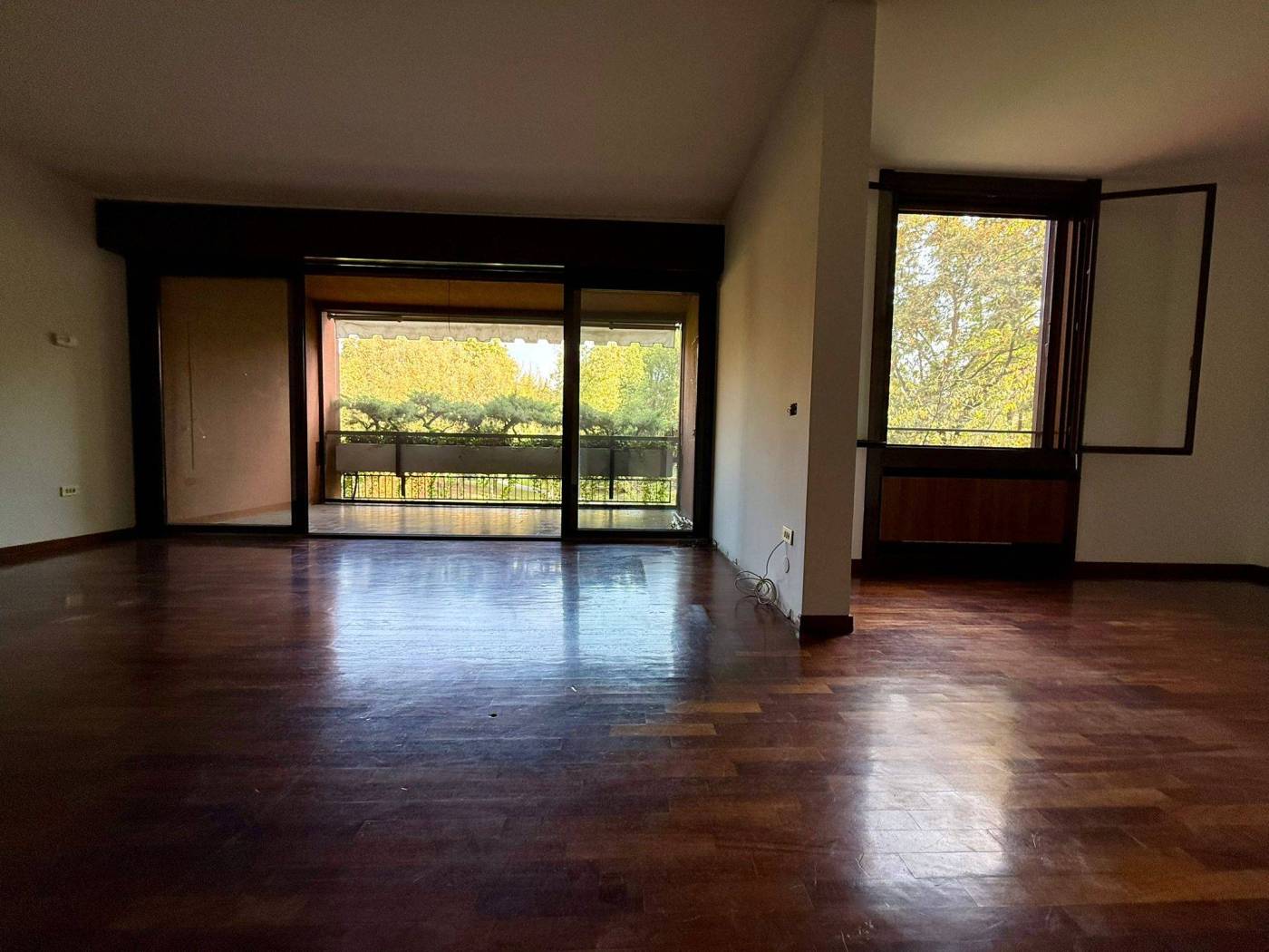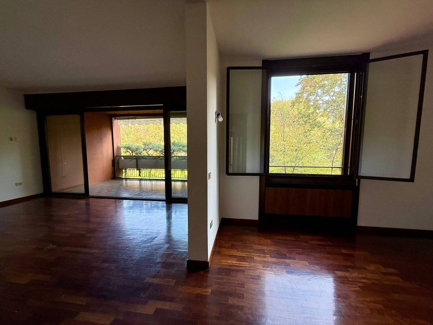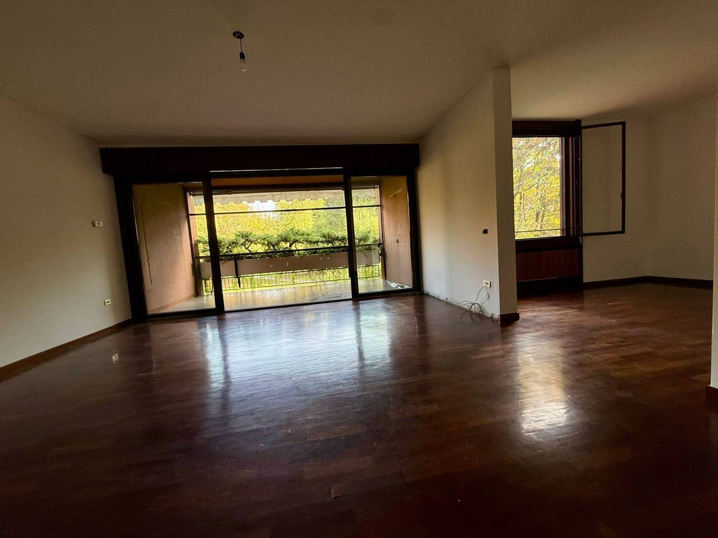 L'appartamento di 4 locali si presenta in ottime condizioni con parquet in tutta la casa, i bagni sono di capitolato ma in ottime condizioni. L'immobile al secondo piano è così composto ingresso con ampio soggiorno doppio, loggia fronte parco con esposizione ad est, cucina abitabile con balcone di servizio, due camere da letto, due bagni di cui uno cieco, una cantina al piano terra e la possibilità di un box medio pari ad un valore di 30.000,00Eu..